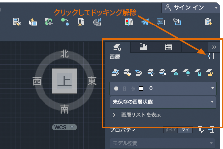 [画層]パレットは大きなスペースが必要なうえ、常にすべてのオプションが必要とは限りません。最も一般的な画層コントロールにすばやくアクセスするには、[画層]パレットをドッキングします。オブジェクトが選択されていない場合、パレットには現在の画層の名前が次のように表示されます。