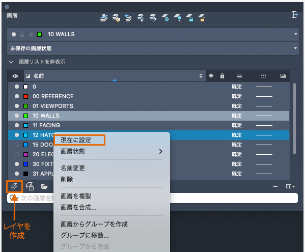 画層を作成するには、下図の[新規画層を作成]ボタンをクリックし、新しい画層の名前を入力します。現在の画層を変更するには、画層名をダブルクリックするか、画層名を右クリックして[現在に設定]を選択します。