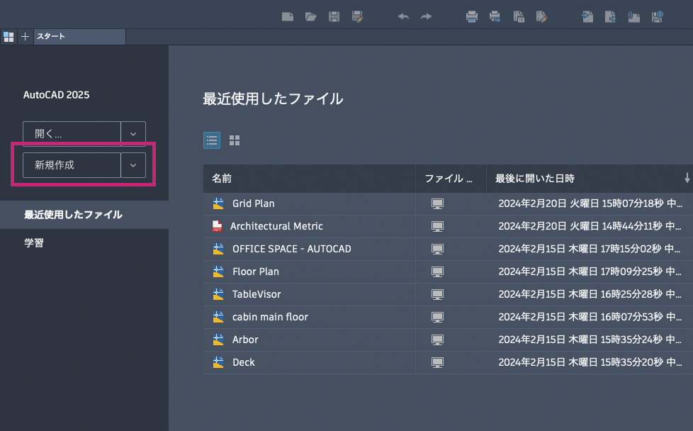AutoCAD を起動した後、[スタート]タブで[新規作成]をクリックするか、[新規作成]ドロップダウン メニューをクリックして新規図面を開始します。