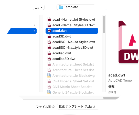 任意の図面(.dwg)ファイルを、図面テンプレート(.dwt)ファイルとして保存できます。既存のテンプレート ファイルに基づいて図面テンプレート ファイルを作成するには、既存の図面テンプレート ファイルを開いて修正し、別のファイル名で保存します。