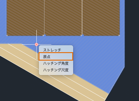 上のデッキ ボードのように、ハッチングでパターンを位置合わせする必要がある場合は、ハッチングの原点グリップにカーソルを合わせ、[原点]を選択して位置合わせ点を指定します。