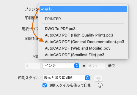 [プリンタ/プロッタ]ドロップダウン リストから、 [AutoCAD PDF (General Documentation).pc3] を選択します。