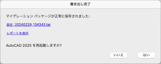 このユーティリティは、書き出されたカスタム設定とカスタムファイルを含む zip ファイルを作成します。これらの設定やファイルは、他のコンピュータに読み込むことができます。各コンピュータは、同じバージョンの AutoCAD または AutoCAD LT を実行している必要があります。