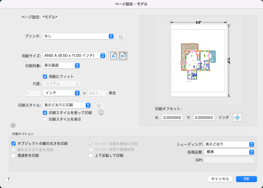 [レイアウト]、[図面範囲]: レイアウトを印刷する場合は、レイアウトの 0,0 から基点が計算され、指定した用紙サイズの印刷可能領域の内側にすべてが印刷されます。[モデル]タブから印刷する場合は、グリッド範囲で定義した作図領域全体が印刷されます。現在のビューポートにプラン ビューが表示されていない場合、このオプションは、[オブジェクト範囲]と同じ効果になります。