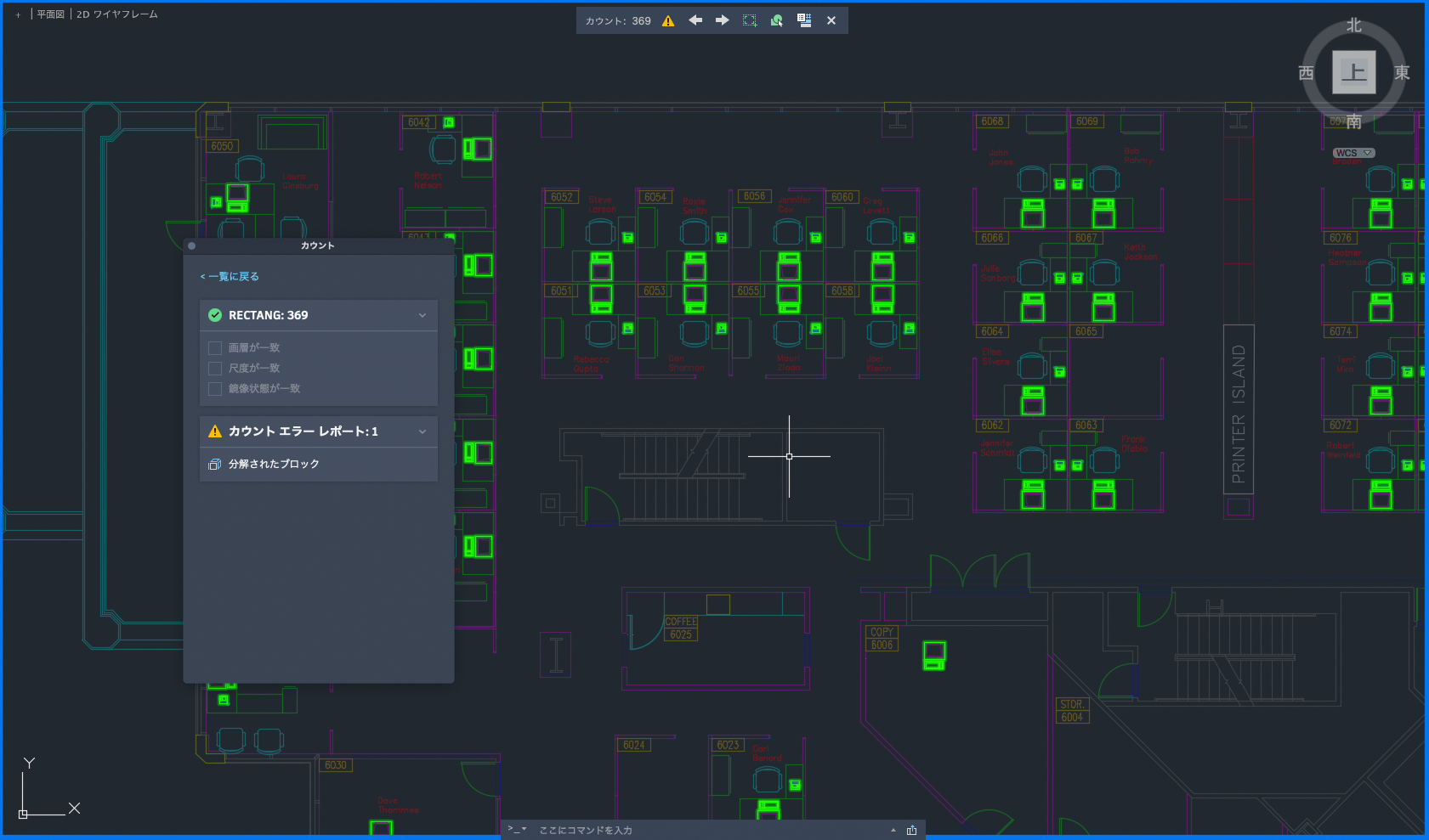 [カウント]パレットには、ブロック名と各ブロックの数が表示されます。アクティブなカウントを実行している場合、[カウント]パレットには、エラー レポート(存在する場合)を含むカウントの詳細が表示されます。レポートには、重なっているオブジェクト、分解されたオブジェクト、名前が変更されたオブジェクトなどのカウント エラーが一覧表示されます。