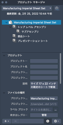 [詳細]パネル: プロジェクト ツリー表示で選択した項目のプロパティが表示されます。[詳細]パネルの表示を切り替えるには、[プロジェクトマネージャ]の下部にある[詳細を表示]/[詳細を非表示]ボタンをクリックします。