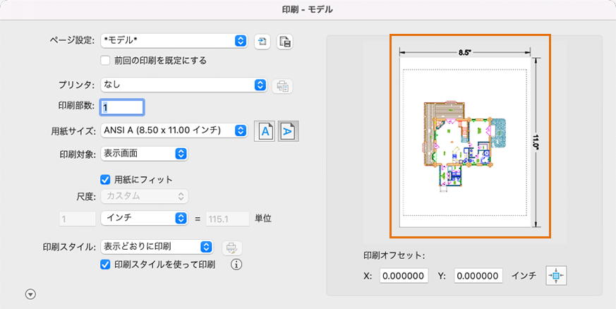 プレビュー領域を使用すると、印刷時に図面がどのように出力されるかを簡単に確認することができます。