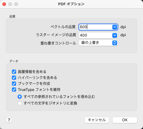 - PDF ファイルに TrueType フォントを埋め込み、PDF ビューアで使用可能にする必要をなくします。このオプションをオンにしないと、PDF ビューアでは代替フォントが使用されます。