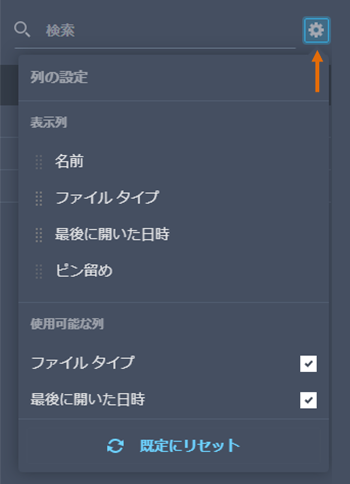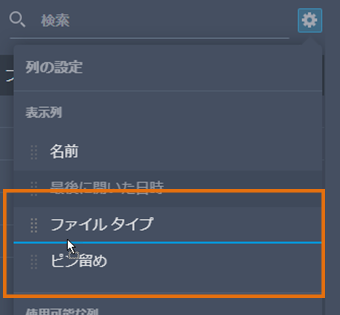- リスト表示で[設定]をクリックすると、列見出しをカスタマイズすることができます。[名前]と[ピンで固定]の列は不変です。