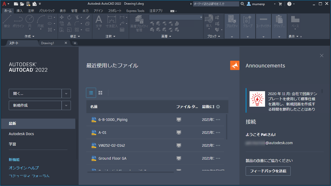 [スタート]タブが再設計され、オートデスク製品の一貫したウェルカム エクスペリエンスが提供されるようになりました。