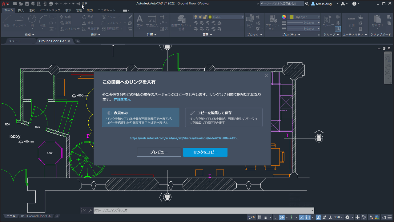 現在の図面のコピーへのリンクを共有し、AutoCAD Web アプリで表示または編集することができます。関連するすべての DWG 外部参照とイメージが含まれます。