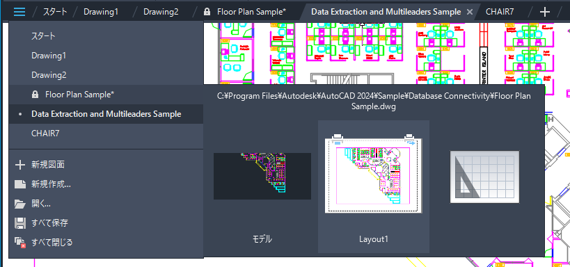 新しいファイル タブ メニューを使用して、図面の切り替えたり、図面の作成または開いたり、すべての図面を保存したり、すべての図面を閉じたりすることができます。