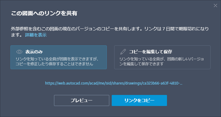 [共有]は、AutoCAD デスクトップの ETRANSMIT[e-トランスミット]と同じように動作します。共有ファイルには、外部参照やフォント ファイルなど、関連するすべての従属ファイルが含まれます。 リンクを知っているすべてのユーザは、AutoCAD Web アプリで図面にアクセスできます。リンクは、作成後 7 日で有効期限が切れます。受信者の権限は、表示のみと編集と保存が可能の 2 つのレベルから選択できます。