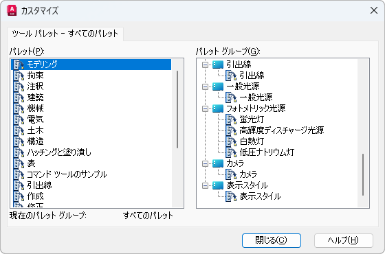 ツール パレット グループとそれぞれに含まれるツール パレットが表示されます。