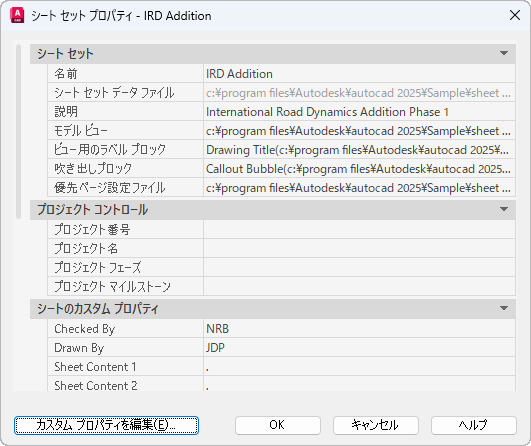 これには、シート セット データ(DST)ファイルのパスとファイル名、シート セットに関連付けられている図面ファイルを含むフォルダのパス、シート セットに関連付けられているカスタム プロパティなどがあります。