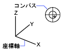 ビューポート内で視線方向を定義するために使用するコンパスと座標軸が表示されます。