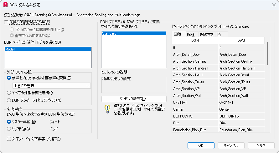変換に適した変換単位を選択します。読み込まれた DGN ファイルには、「マスター単位」と「サブ単位」と言われる作業単位(フィート/インチ単位かメートル単位)が含まれます。選択した作業単位(マスター単位またはサブ単位)は、DWG の単位に 1 対 1 で変換されます。