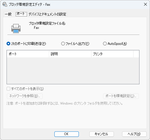 使用可能なローカル ポートとネットワーク ポートのリスト、および各ポートの説明が表示されます。ネットワーク ポートの場合は、ネットワーク プリンタの名前も表示されます。