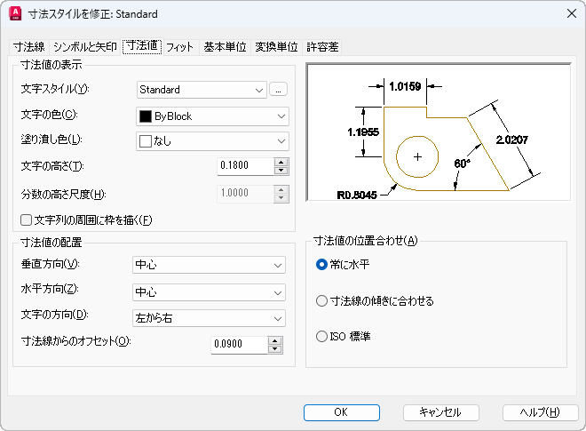 このタブで指定した文字スタイルの文字の高さが固定されている場合は、その高さがここで設定した文字の高さよりも優先されます。ここで寸法値の高さを設定する場合は、文字スタイルの高さが 0 (ゼロ)に設定されていることを確認してください。文字スタイルの文字の高さを設定する方法については、STYLE[文字スタイル管理]コマンドを参照してください。