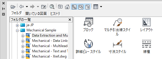 [DesignCenter]ウィンドウの左側部分のツリー表示と DesignCenter のタブを使用して、コンテンツを検索したりコンテンツ領域にロードすることができます。