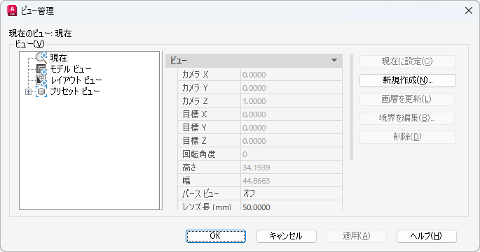 モデル ビューおよびレイアウト ビューに対して、名前の付いたビューに割り当てられているビューの種類が表示されます。