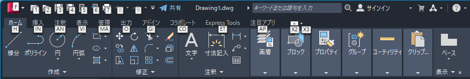 ポインティング デバイスの代わりにキーストロークを使用し、メニュー、クイック アクセス ツールバー、およびリボンで選択を行えます。現在のワークスペースで使用できるキーストロークを確認するには、[Alt]キーを押します。