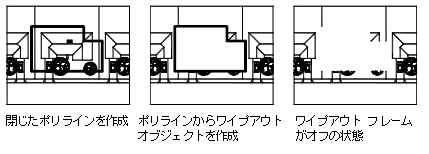 「ワイプアウト オブジェクト」は、背後のオブジェクトを現在の背景色で隠すポリゴン領域です。ワイプアウト領域はワイプアウト フレームによって定義され、編集時にはオンにし、印刷時にはオフにすることができます。