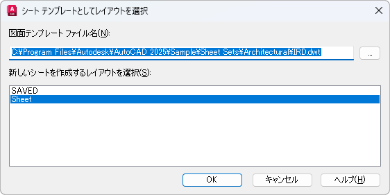新しいシートに使用する図面テンプレート ファイル内のレイアウトの名前が一覧表示されるので、その中から指定します。