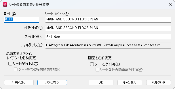 このチェック ボックスをオンにすると、図面ファイル名がシート タイトルに合わせて変更されます。