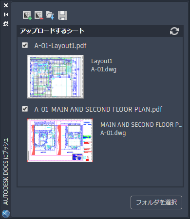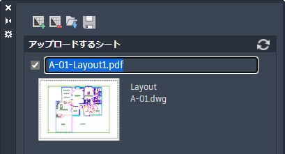 [Autodesk Docs にプッシュ]パレットが表示され、そこで PDF として Autodesk Docs にアップロードする AutoCAD レイアウトを選択できます。