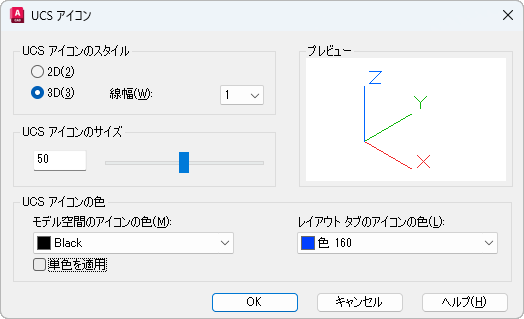 モデル空間での UCS アイコンのプレビューが表示されます。