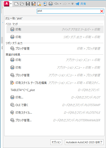 アプリケーション メニューの上部に[コマンド検索]フィールドが表示されます。検索結果には、メニュー コマンド、基本ツールチップ、コマンド プロンプト文字列が含まれます。検索語句は、任意の言語で入力できます。結果は、現在のワークスペースに適用されます。