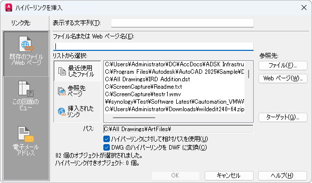 ハイパーリンクに関連付けたファイルへのパスが表示されます。[ハイパーリンクに対して相対パスを使用]チェック ボックスをオンにしているときは、ファイル名だけが表示されます。このチェック ボックスをオフにしているときは、絶対パスとファイル名が表示されます。