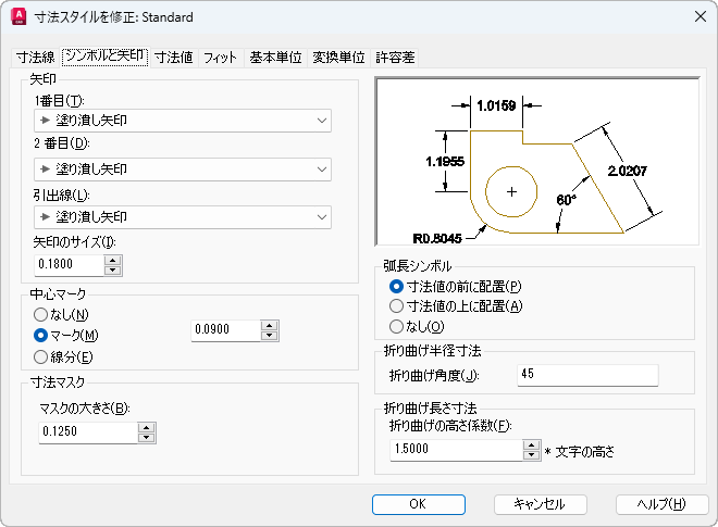 寸法スタイルの設定に行った変更の結果を示すサンプルの寸法イメージが表示されます。
