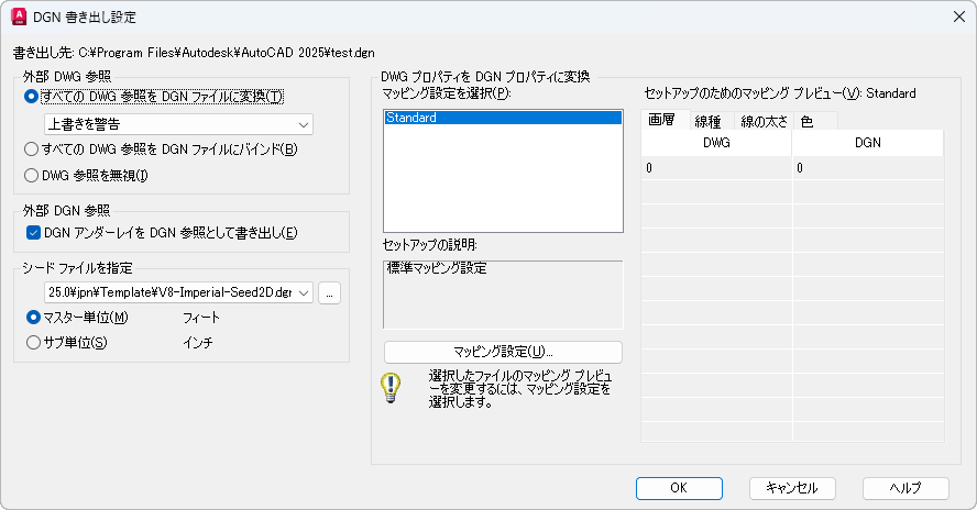 現在の DGN 書き出しに使用するマッピング設定を選択および管理します。
