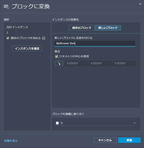 ソース オブジェクトまたは選択したインスタンスを新しいブロックに変換することもできます。[変換]ダイアログ ボックスで、ブロック名と挿入位置を指定して、新しいブロックを定義します。既定では、挿入位置は選択したジオメトリの中心に設定されます。