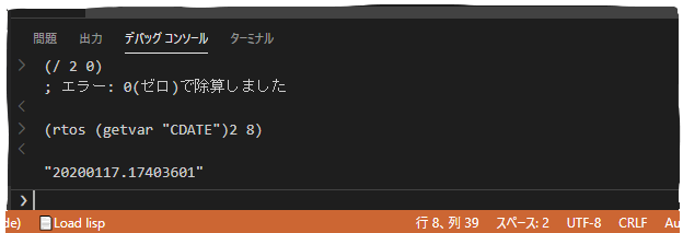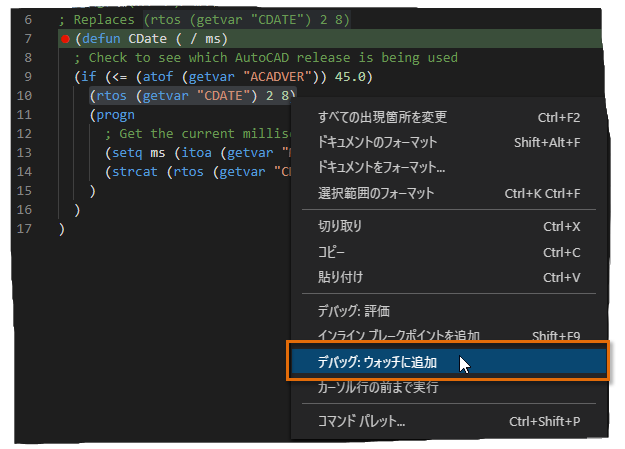 - Visual Studio Code で、AutoLISP ソース(LSP)ファイルのデバッグを開始します。