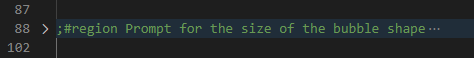 VS Code は AutoLISP 文または複数行にまたがる DCL 定義に基づいて、「リージョン」と呼ばれるものを自動的に定義します。リージョンを展開または折りたたむことで、エディタ ウィンドウに現在表示されているコード文の数を最小限に抑えることができます。ユーザ定義リージョンを挿入して、サブ領域とも呼ばれる複数の文およびリージョンを、単一の折りたたみ可能なリージョンにグループ化することもできます。