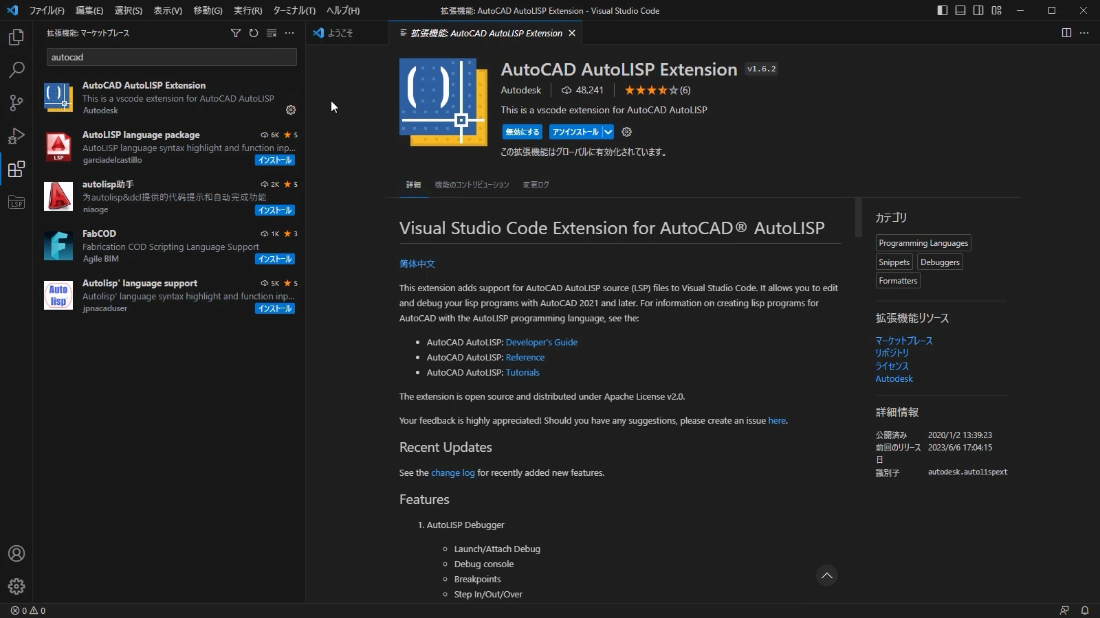 AutoCAD AutoLISP Extension for Visual Studio Code をインストールして環境設定する方法を説明します。