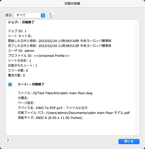 すべての完了した印刷とパブリッシュのジョブおよびこれらのジョブのシートに関する情報が表示されます。