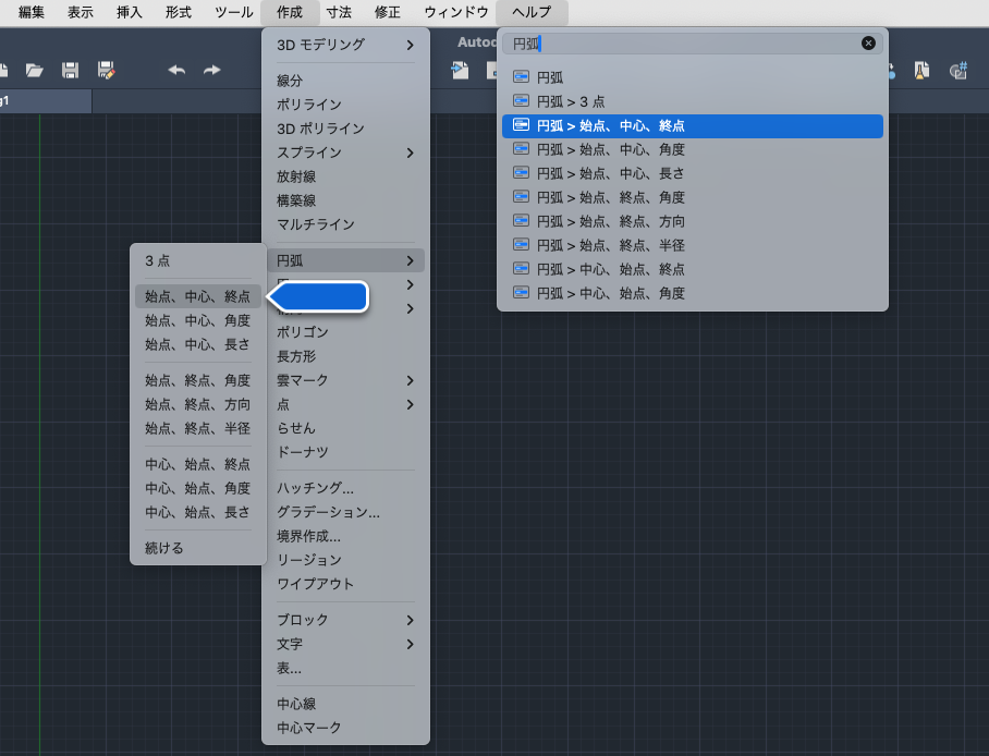 カーソルをリスト内のコマンドに合わせると、矢印でそのコマンドの場所が示されます。