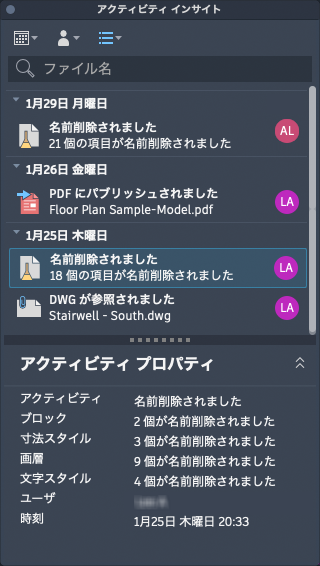 アクティビティ インサイトは、図面ファイルを開いて作業するたびに、アクティビティを追跡します。また、Finder で図面の名前変更やコピーなど、プログラム外のイベントの一部を追跡することもできます。図面を開くと、図面内で実行された過去のアクティビティがアクティビティ インサイト データベースから読み取られ、[アクティビティ インサイト]パレットに時系列で表示されます。表示されるアクティビティは、使用している製品に限定されます。たとえば、AutoCAD LT では、サポート対象のクラウド ストレージ プロバイダに保存された図面を使用して作成されたバージョン アクティビティのみが表示されます。同時に、図面で作業している間にアクティビティがデータベースに書き込まれ、パレットの内容が最新の状態に保たれます。