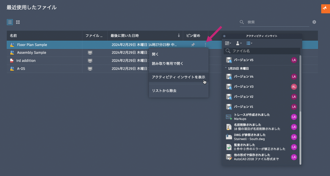 アクティビティ インサイトによって、図面に関して自分または他のユーザが実行した過去のアクションを理解することができます。