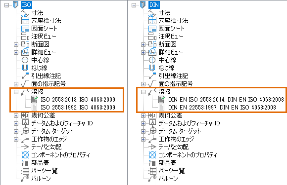 ISO 規格および DIN 規格の新しい履歴に対するサポートが追加されたことにより、溶接規格の最新の履歴を使用して AutoCAD Mechanical ツールセットで作成されたドキュメントに注釈を付けることができます。新しいドキュメントでは最新の履歴を使用できますが、AutoCAD Mechanical ツールセットは引き続き旧バージョンの履歴をサポートし、旧リリースで作成されたドキュメントを開いたり、編集したり、保存できるようになっています。