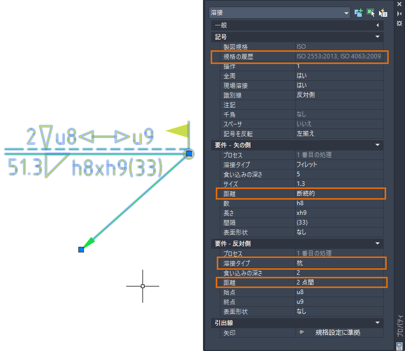 溶接記号が AutoCAD Mechanical 2021 ツールセットで更新され、最新の ISO 規格および DIN 規格の履歴(ISO 2553:2013 および DIN EN ISO 2553:2014)をサポートするようになりました。この変更には、要素記号と追加記号の改訂、および新しい溶接の注釈(2 点間の距離)が含まれます。マルチ基準線のサポートも最新の履歴に追加されています。