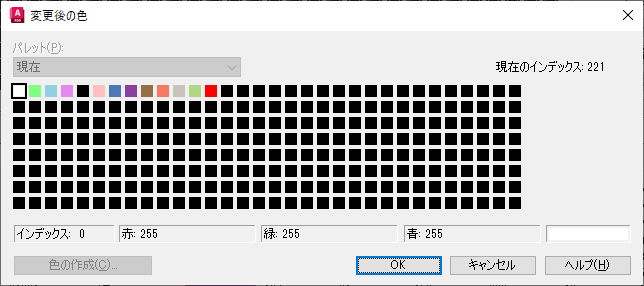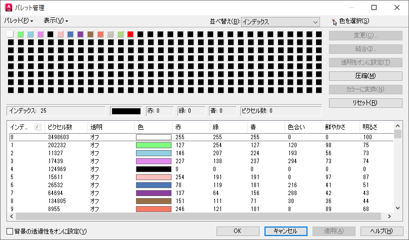 [結合]をクリックします。[変更後の色]ダイアログ ボックスで、白いボックスをクリックし、[OK]をクリックします。 注: 表の[ピクセル数]列が変更され、インデックス 0 と 8 を除くすべてのカラーのピクセル数は 0 になっています。