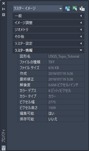 この例は、ラスター イメージを選択したときの[プロパティ]パレットの外観を示しています。イメージ データが[ラスター情報]セクションのプロパティ リストの最後に表示されています。