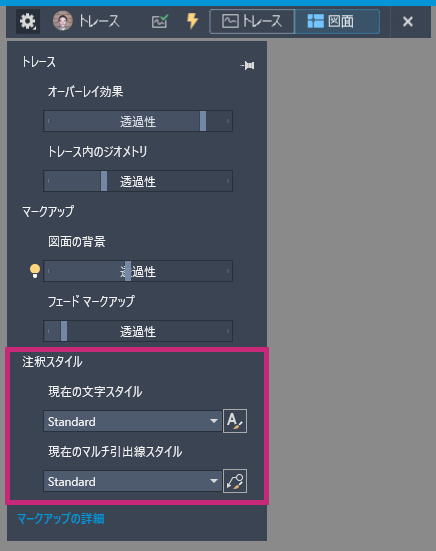- 読み込まれたマークアップを図面編集モードで表示する場合、[設定]ドロップダウンで[注釈スタイル]を使用できます。これにより、マークアップ アシストを使用する際に、現在の文字スタイルとマルチ引出線スタイルを簡単に割り当てることができます。