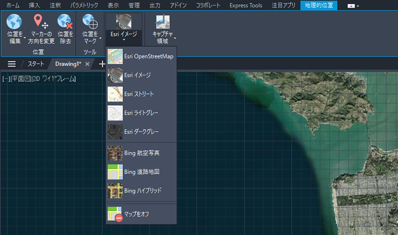 追加された 5 つの Esri Map を使用して、図面ファイルに地理的位置情報を割り当てることができるようになりました。