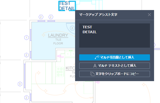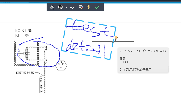 マークアップ アシストは、マークアップを文字、引出線、および雲マークとして自動的に識別します。識別されたマークアップをクリックして、マルチ テキスト、マルチ引出線、または雲マーク オブジェクトとして挿入することができます。挿入する前に文字を編集したり、文字をクリップボードにコピーすることを選択したりできます。